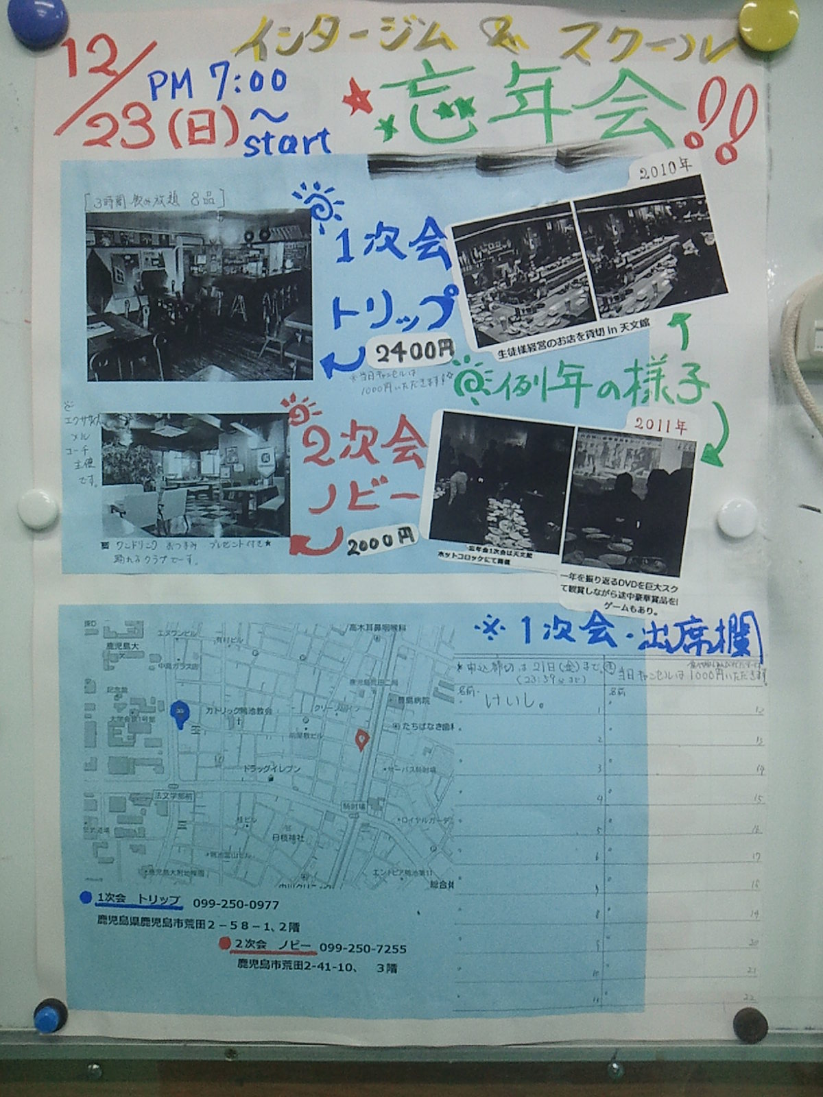 2 次会は出欠必要なしです。1次会のあと10時前後にエクササイズのメルコーチ主催のクリスマスパーテイーへ自由参加です。店名;ノビー;鹿児島市荒田 2-41-10、3階。電話099-250-7255。踊るもよしゆっくり飲むもよし。エントリー2000円にワンドリンク、おつまみ、クリスマスプレゼ ントつきで深夜3時までfoods barが一日クラブに変身だそうです!