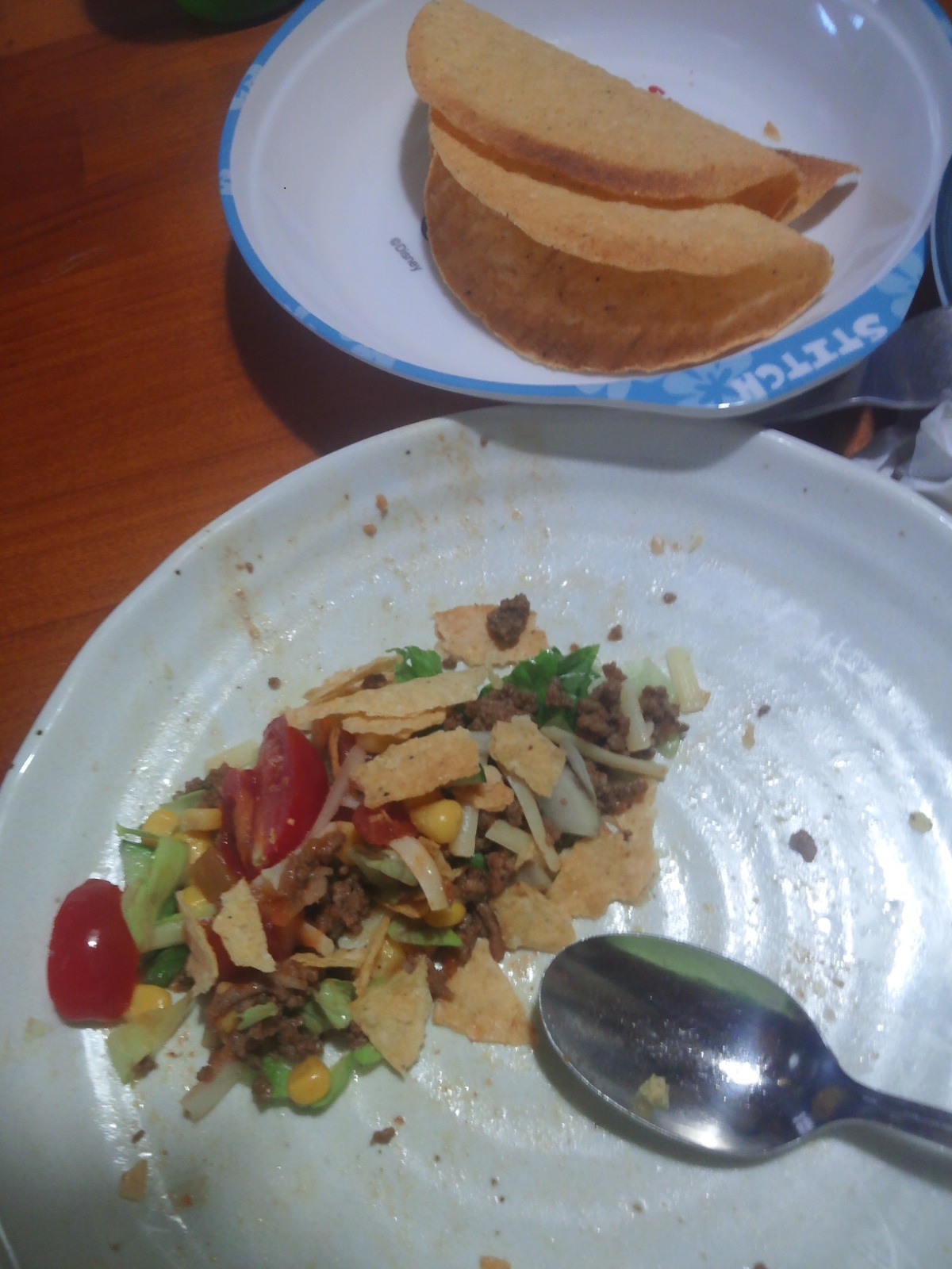 欧米等で簡単な食事といえばハンバーガー(日本ではおにぎり?)、ピザ(お好み焼き?)、ケバブロール、ホットドッグ、ミートパイ(思いつきません)、タコス(長崎ちゃんぽん)といったところでしょうか、、今回はタコス。日本の手巻き寿司感覚というか好きな具材を各取り皿にわけて各自がとうもろこしのチップスみたいなhard shell パンみたいなsoft shellで包んで食べるといった具合です。好みで各自食べられ簡単に準備できるのでパーテイーなどでよく出されます。 という事で久々にタコスパーテー。日本なので食材はいろいろ、なんと白ご飯(欧米では野菜の類い)まで登場。いつもはやわらかいパン生地に食材をいれてタコスソースをいれて食べるのですが、ハードシェルを購入して試してみましたが、、、これほど食べににくいのはないという事で具材とソースを混ぜてその上につぶしたハードシェルチップをかけてスプーン食べてみました。う~ん長崎ちゃんぽんそのものでした。お試しあれ!!高価なハードシェル購入よりも100円のタコスチップス購入した方がよかったです。 写真。 鹿児島英会話/エクササイズ。インタージム&スクール。http://intergym.client.jp/ PR |